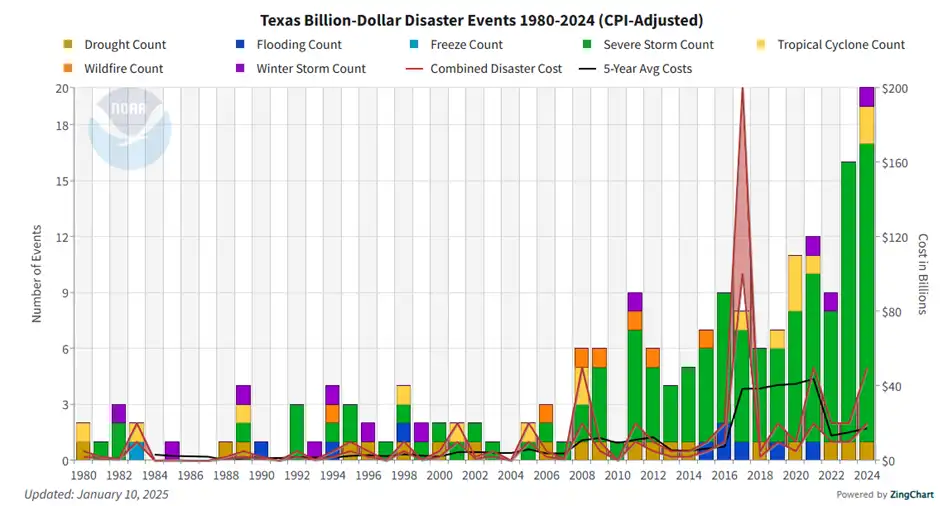 These “across the board” rate increases are affecting everyone and coming from every carrier. If you disregard temporary economic problems like building material shortages and higher than average inflation, what are we left with? The answer is astonishing: a significant uptick in severe convective storms in Texas. There is a reason your wind and hail deductible is separate and higher than your policy deductible: Roof damage is one of the most common and expensive repairs that needs to be made on a home. As you can see from the graph below, billion-dollar weather events have increased 3X since 2008. These severe convective storms bring strong winds and hail which are the primary causes of roof damage. Insurance companies are losing money and the weapons they have at their disposal are: