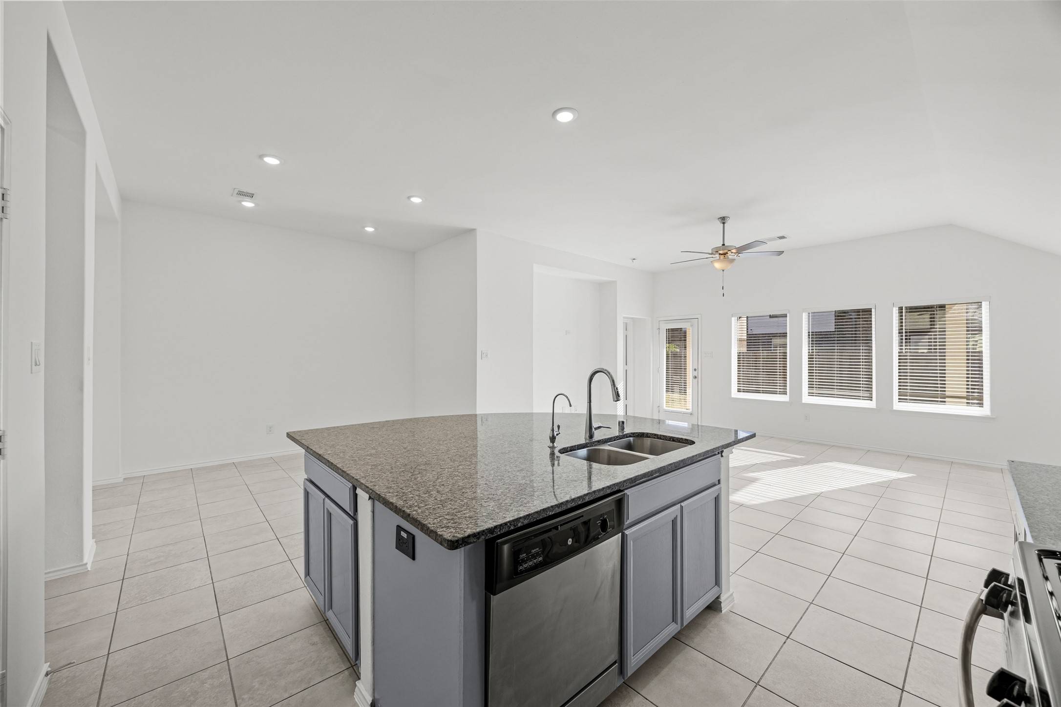 entertaining. The kitchen offers abundant storage and counter space, flowing seamlessly into the